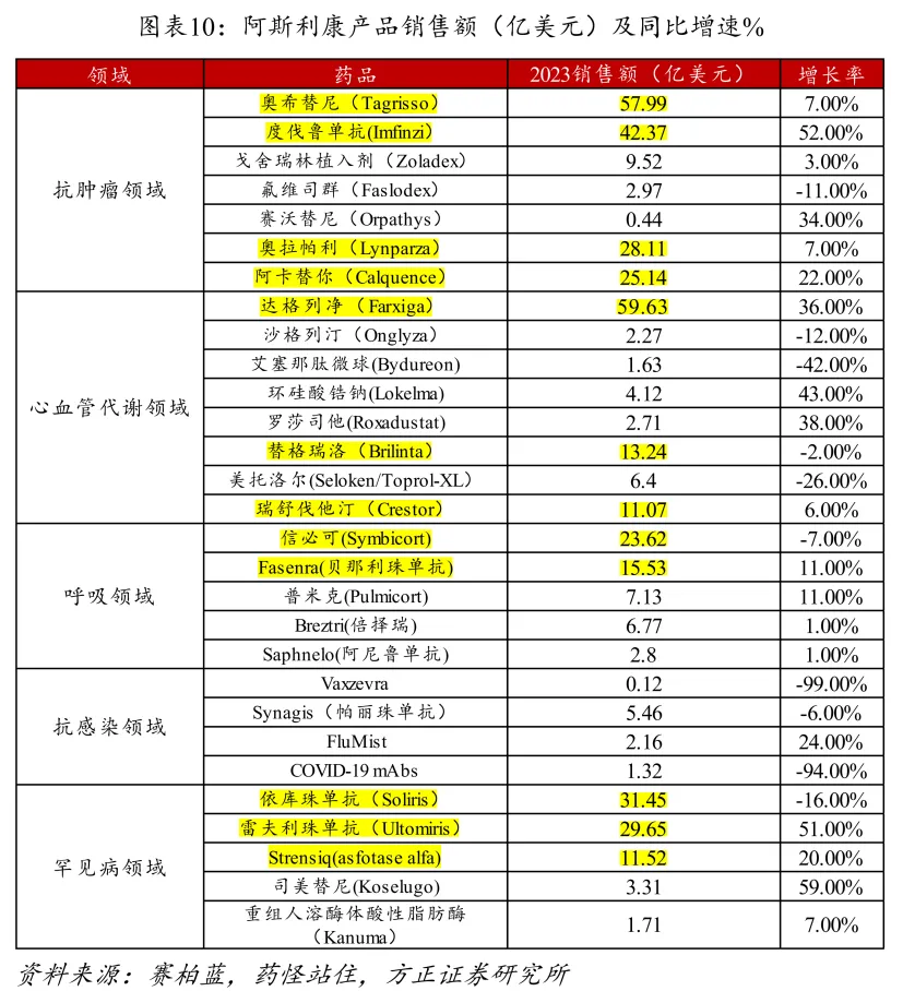 2023年,阿斯利康有多达12款产品的销售额突破了10亿美元,包括抗肿瘤领域的奥希替尼、度伐鲁单抗、奥拉帕利,心血管代谢领域的达格列净、替格瑞洛,以及罕见病领域的依库珠单抗、雷夫利珠单抗。