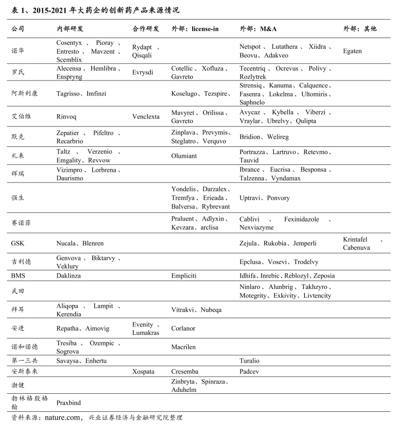 2015-2021年大药企的创新药产品来源情况;图片来源:兴业证券研报