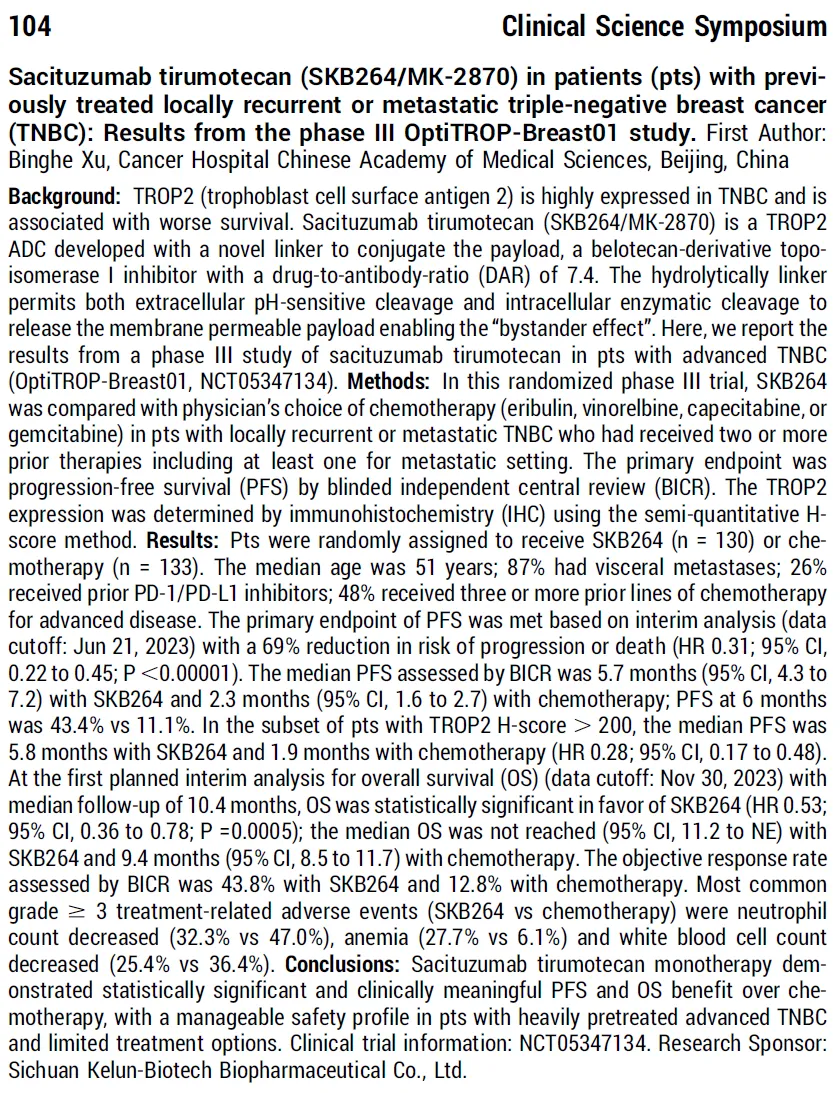 在2023年第46届美国圣安东尼奥乳腺癌研讨会(SABCS)将于美国中部时间(CST)上,科伦博泰生物亦以POSTER SPOTLIGHT PRESENTATION形式公布了SKB264(MK-2870)用于治疗局部晚期或转移性三阴性乳腺癌(TNBC)患者II期拓展研究临床结果。