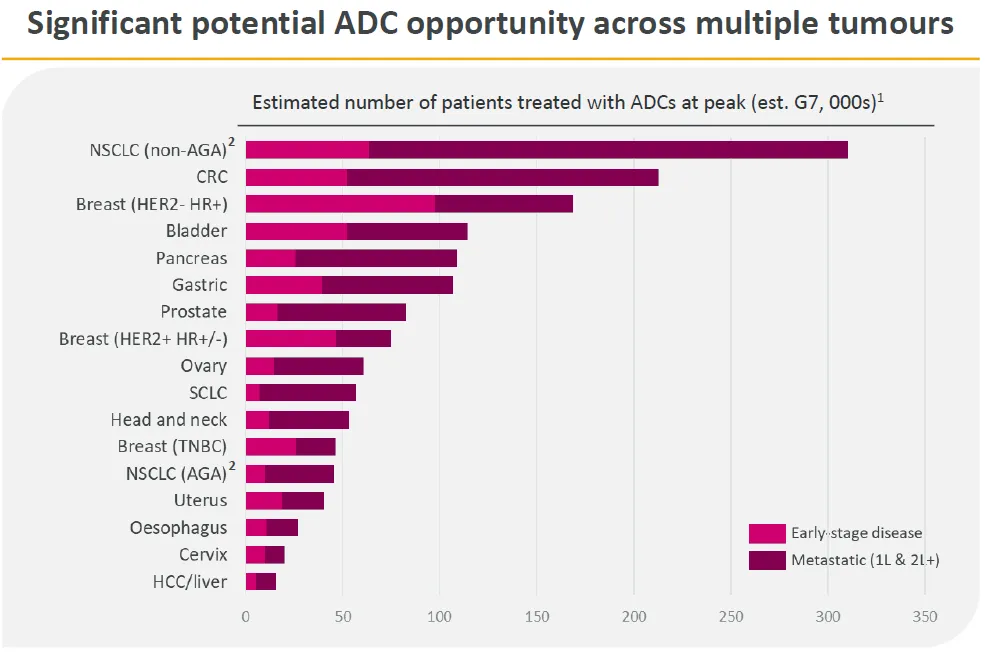 根据阿斯利康公布的流行病学和药物应用趋势分析数据,预计未来G7国家三阴乳腺癌使用ADC治疗的峰值人数将接近50000例/年,包括近30000例前线治疗和近20000例复发性的后线治疗患者。
