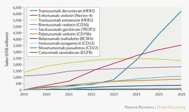 ADC药物正在系统性地替代化疗,应用场景日益广阔。根据波士顿咨询2021年在Nature Reviews Drug Discovery发表的分析文章,预计2026年ADC药物市场规模将达到160亿美元,现在看来这一预测明显偏保守。2023年全球ADC药物市场规模已经达到106亿美元,今年一季度32亿美元。对于吉利德的Trop2 ADC,该文章预测2026年销售额11亿美元,实际上2023年即达到10.6亿美元,今年一季度销售额3亿美元,仍然保持高速增长。