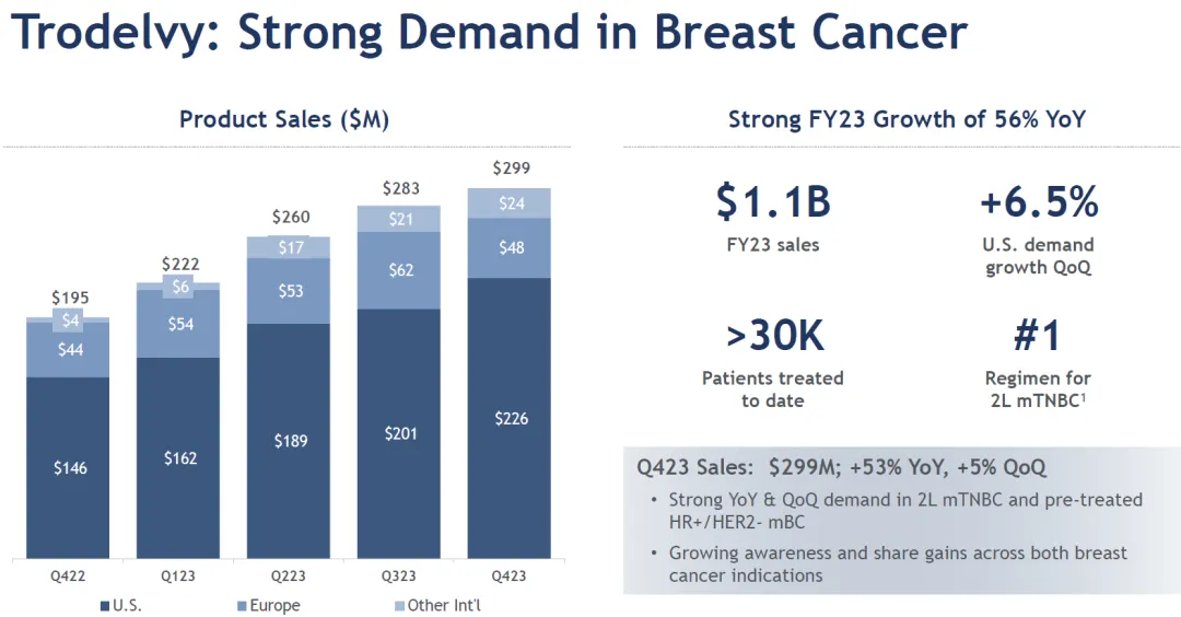 值得一提的是,Trodelvy超预期的销售额还是在获批适应症比较有限的前提下实现的,包括2020年4月获批的三阴乳腺癌、2021年4月获批的尿路上皮癌、2023年2月获批的HR+/HER2-乳腺癌。Trodelvy目前在三阴乳腺癌二线治疗占据主导地位,且处于快速增长阶段(季度环比强劲增长),换言之其在2023年的10.6亿美元销售额主要由三阴乳腺癌贡献。