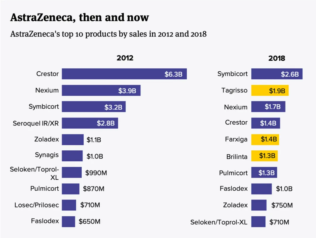 2012年和2018年阿斯利康销售前10的产品(图源:BioPharma Dive)
