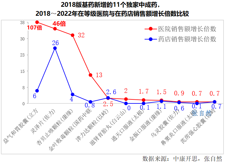 合肥立方制药的益气和胃胶囊,在等级医院的销售额由2018年的170万元增加到了2022年的1.84亿元,4年增长了107倍;在药店由2018年的260万元增加到了2022年的1800万元,4年增长了6倍;可见,在医院的销售增速远高于在药店的增速,该品种2023年在医院销售进一步提升到了2.8亿元。