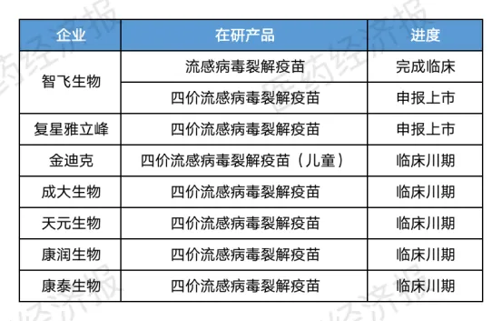 除了已获批上市的产品,国内还有多家企业在布局四价流感疫苗赛道,包括复星医药子公司雅立峰生物、步长制药子公司天元生物的四价流感疫苗生产注册均已获受理,智飞生物的四价流感病毒裂解疫苗目前处于申报上市阶段,正在审评中。此外,还有包括康润生物、康泰生物、成大生物的四价流感疫苗产品均处于III期临床阶段。