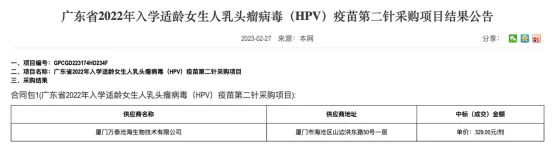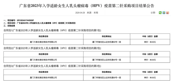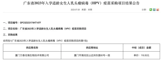 4月底,广东省政府采购中心公布2023年入学适龄女生HPV疫苗第二针采购项目结果,万泰生物的二价HPV疫苗以86元的单价中标。而2023年2月、2023年7月,同款疫苗的中标价格分别是329元、116元。