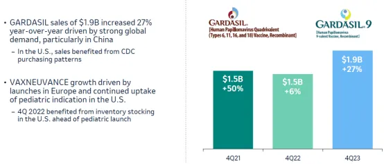 与二价相比,九价预防的HPV类型更多,因此更受市场欢迎。目前,全球仅有默沙东的九价HPV疫苗佳达修9获批上市。默沙东财报显示,2023年第4季度,佳达修(Gardasil)/佳达修9的销售额增长27%至19亿美元,2023年全球销售额增长29%至89亿美元,剔除汇率影响,销售额增长33%。