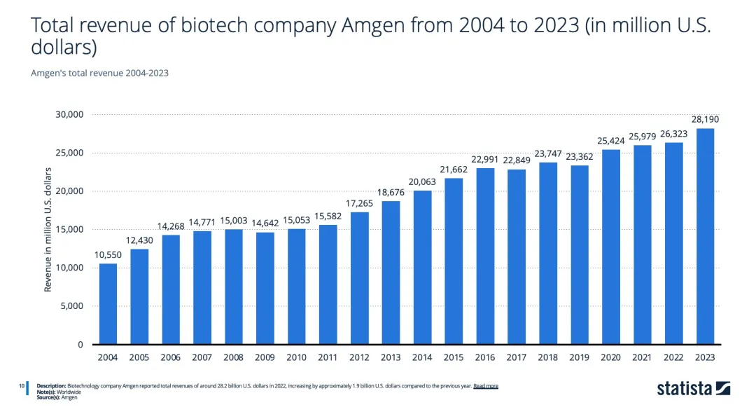 翻开安进的历史,矛盾似乎贯穿至今。从21世纪的第一个十年销售额翻五倍,股价却几乎没变,到第二个十年股价一飞冲天;推出红、白药、地舒单抗、KRAS抑制剂等“黄金产品”,却也大笔进军生物类似药业务……