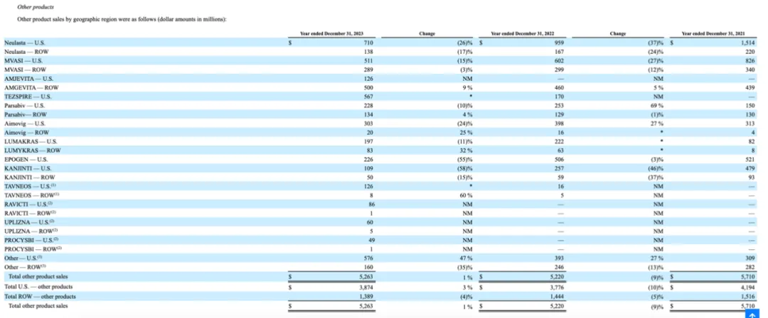 不过从结果来看,截止到2024年,安进已经推出了5款生物类似药,包括Riabni(利妥昔单抗)、Mvasi(贝伐珠单抗)、Kanjinti(曲妥珠单抗)、Avsola(英夫利昔单抗)以及Amjevita(阿达木单抗)。从销售额上看,这5款产品在2023年销售额总计仍不如安进一款核心创新药的销售额,甚至多数产品的增速仍在下滑。