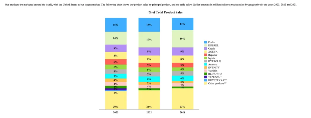 除此之外,在2012年Robert Bradway接棒后,安进的另一项重要举措是向全球拓展,不过从其2023年财报来看,美国市场仍然是安进的核心,在美国之外,主要还是采用合作的方式进行产品的市场准入。这一方式的结果也表现为安进的产品区域销售比例并不平衡,2023年在美国市场,安进的收入为192.72亿美元,但其他市场仅为76.38亿美元,不足美国市场的一半。