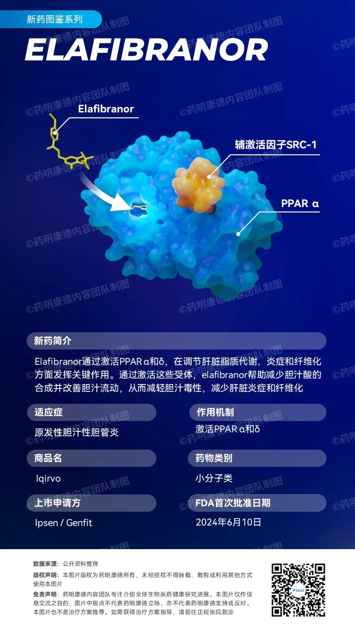 益普生(Ipsen)今天宣布,美国FDA已加速批准Iqirvo(elafibranor)80毫克片剂与熊去氧胆酸(UDCA)联合用于治疗对UDCA应答不足的成人原发性胆汁性胆管炎(PBC),或作为单药疗法治疗对UDCA不耐受的患者。根据新闻稿,Iqirvo是近十年来首个获批用于治疗罕见肝病原发性胆汁性胆管炎的新药。益普生已向欧洲药品管理局(EMA)和英国药品和健康产品管理局(MHRA)提交监管申请,预计两者将在2024年下半年作出最终监管决定。