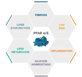 Elafibranor是一种每日一次、口服、“first-in-class"双重过氧化物酶体激活受体(PPAR)α/δ激动剂,目前正在研究用于治疗罕见自身免疫性PBC患者。同时靶向活化PPAR α/δ可潜在治疗PBC的炎症、胆汁淤积和纤维化。2019年,美国FDA授予elafibranor突破性疗法认定,用于治疗对UDCA应答不佳的PBC成人患者。