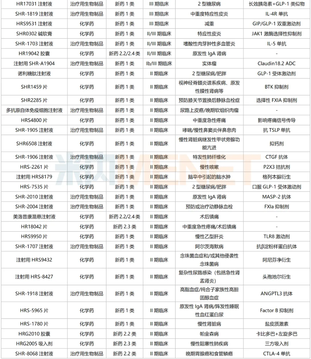 针对热门的CLP-1靶点,恒瑞医药已有6款相关产品获批临床,其中长效胰岛素+GLP-1类似物HR17031注射液(2型糖尿病)、GIP/GLP-1双重激动剂HRS9531注射液(减重)已步入III期临床;GLP-1受体激动剂诺利糖肽注射液(2型糖尿病/肥胖)、口服GLP-1受体激动剂HRS-7535片(2型糖尿病/肥胖)正在开展II期临床;GLP-1/GCGR双重激动剂SHR-1816注射液(糖尿病)、口服GLP-1/GIP双受体激动剂HRS9531片(超重或肥胖/2型糖尿病)处于I期临床。