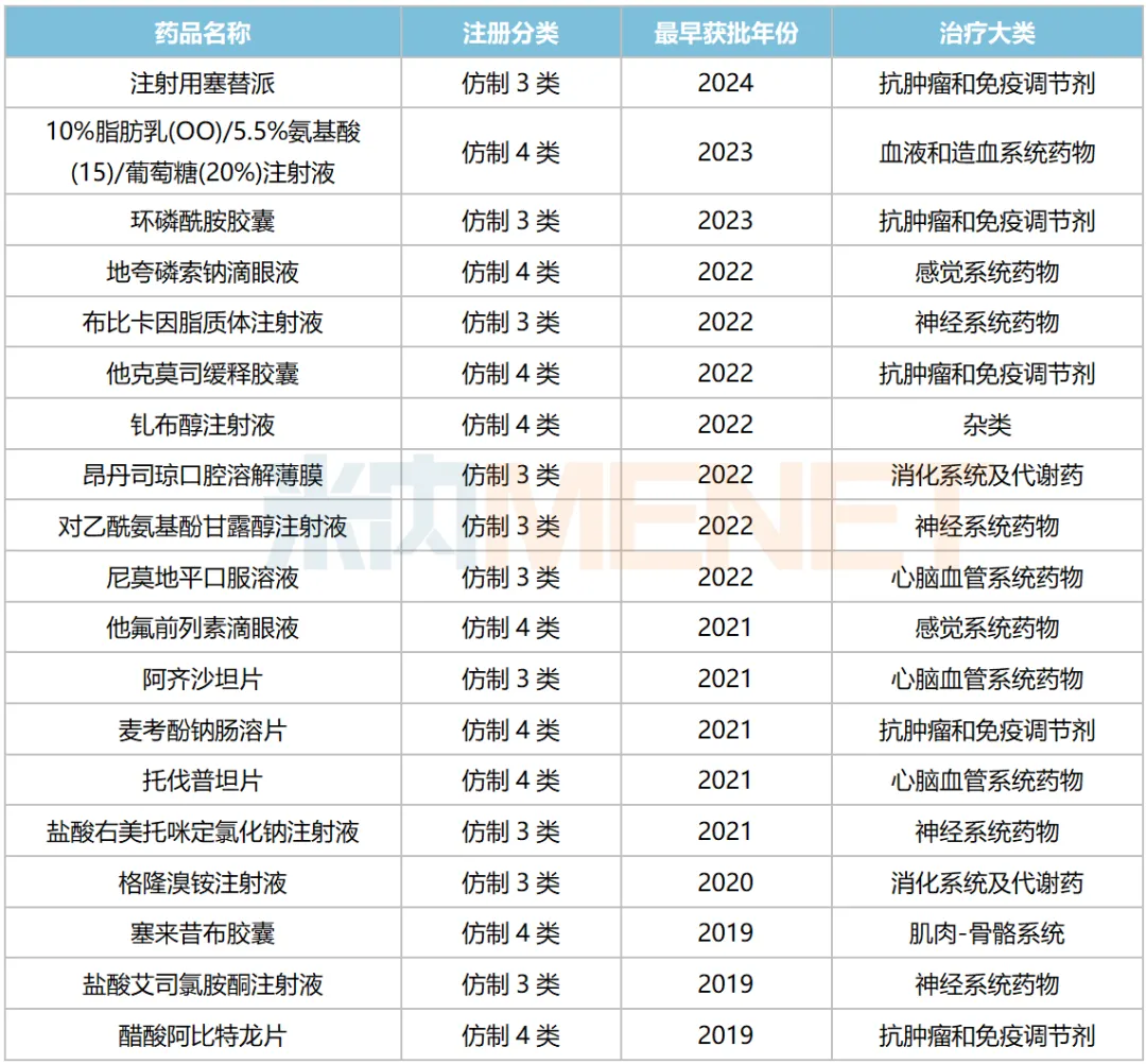 据不完全统计,2019年以来,公司有19个首仿(含剂型首仿)在国内获批生产并视同过评,其中注射用塞替派、环磷酰胺胶囊、布比卡因脂质体注射液、昂丹司琼口腔溶解薄膜、盐酸艾司氯胺酮注射液至今仍为独家品种,10%脂肪乳(OO)/5.5%氨基酸(15)/葡萄糖(20%)注射液至今仍为国产独家品种。