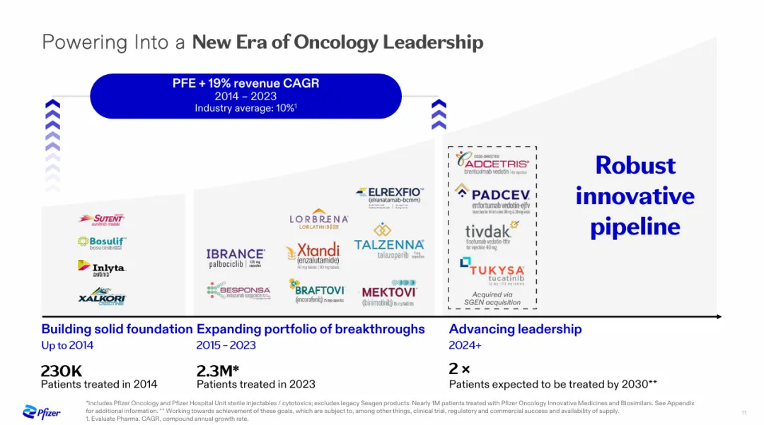 收购Seagen此举使辉瑞的产品管线增加了一倍,达到60个项目,囊获了Adcetris,Padcev,Tivdak和Tukysa四种FDA批准的肿瘤药物。预计收购Seagen将在2024年为辉瑞带来31亿美元的增量收入,到2030年将增加100亿美元的收入。