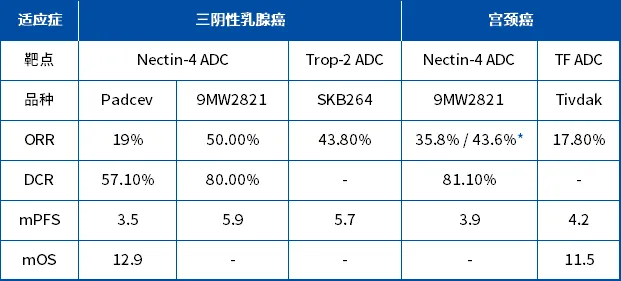 已获FDA批准用于宫颈癌二线治疗的靶向组织因子(TF)的MMAE类ADC药物Tisotumab Vedotin(TV),此前在innova TV 204研究中治疗经治复发或转移性宫颈癌患者的ORR仅为23.8%。据科伦博泰在ASCO大会上披露的最新数据显示,基于BICR评估,TROP2 ADC芦康沙妥珠单抗(SKB264)用于三阴性乳腺癌的ORR为43.8%,mPFS为5.7个月。如此看来,Nectin-4的巨大潜力并不局限于尿路上皮癌,在宫颈癌和三阴性乳腺癌等多个癌种上仍大有可为。