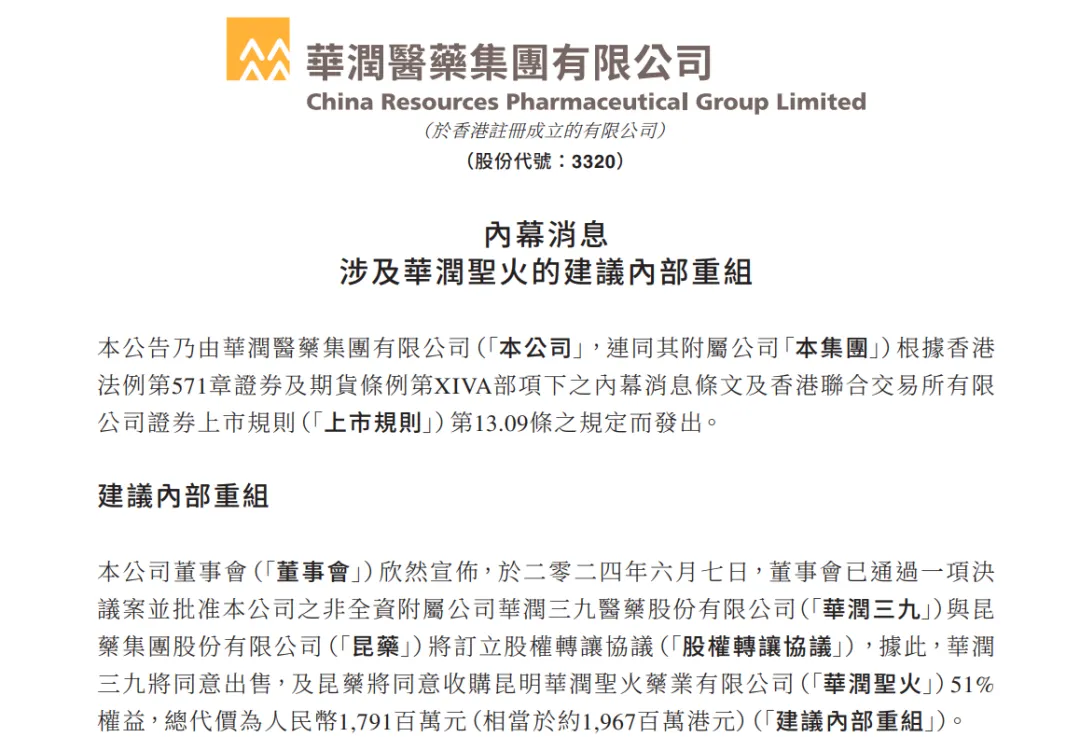 据6月11日华润医药发布的公告,公司董事会已通过关于旗下两家子公司华润三九医药股份有限公司(以下称“华润三九”)与昆药集团股份有限公司(以下称“昆药集团”)所订立的股权转让协议——华润三九将向昆药出售昆明华润圣火药业有限公司(以下称“华润圣火”)51%的权益,作价17.91亿元。