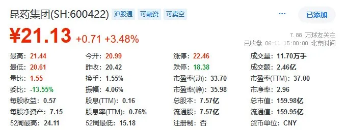 而节后昆药集团亦获得了来自资本市场的正向反馈,6月11日早间以20.99元/股开盘,随后飘红,最高涨幅4.06%,截至当日收盘时,报21.13元/股,涨幅3.48%。
