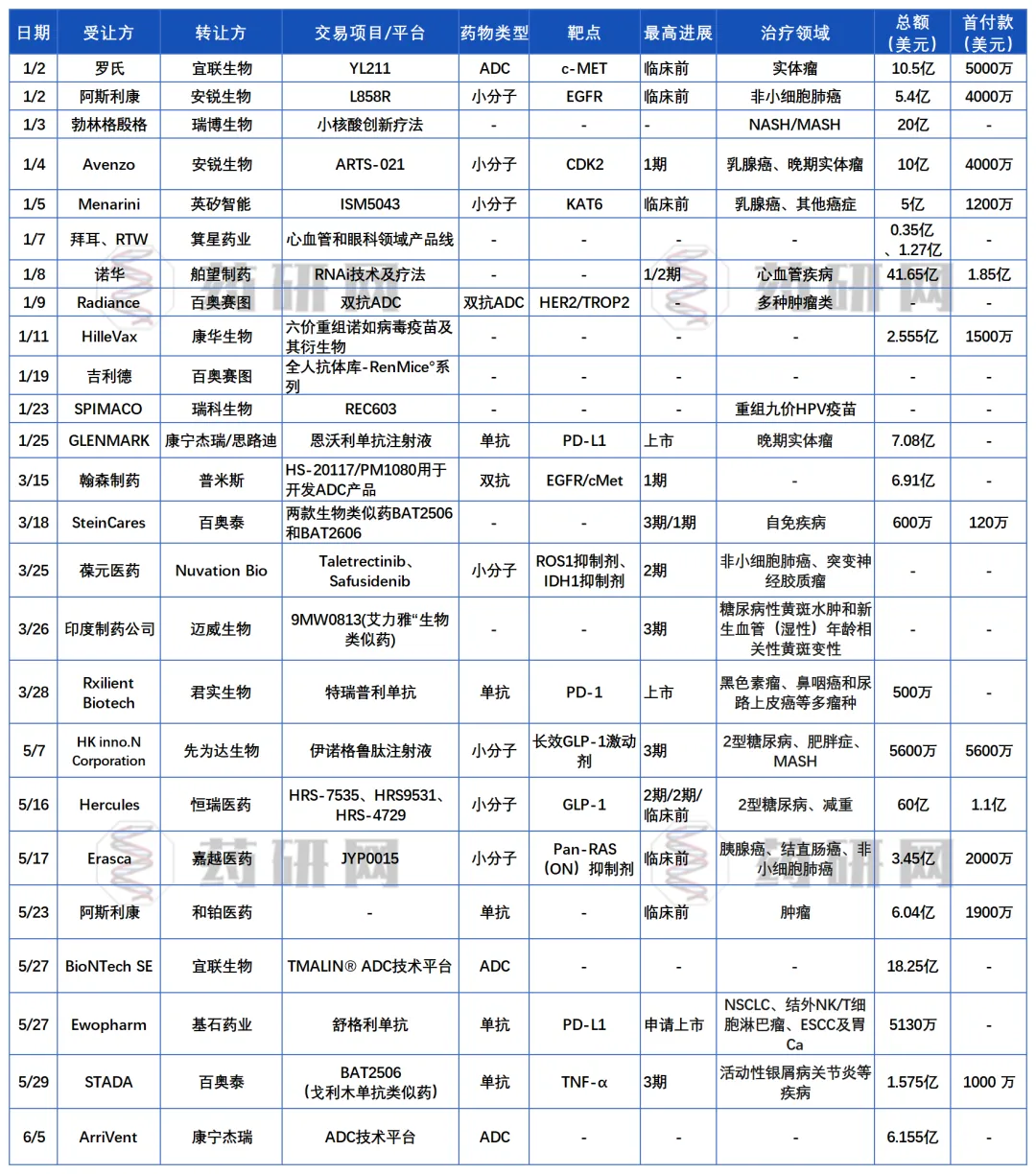 表1 2024年Q1 License-out交易详细信息汇总
