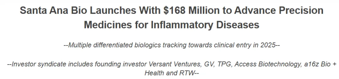6月13日,加利福尼亚州,Santa Ana Bio,一家为自身免疫性和炎症性疾病患者开发靶向疗法的精准免疫学公司,宣布以1.68亿美元的A轮和B轮融资脱颖而出。创始投资者Versant Ventures领导了4300万美元的A轮融资,TPG的生命科学创新基金和GV(谷歌风投)也加入了其中。1.25亿美元的B轮融资由GV(谷歌风投)领投,所有现有投资者以及新投资者Access Biotechnology、Andreessen Horowitz(a16z)Bio+Health和RTW都参与跟投。