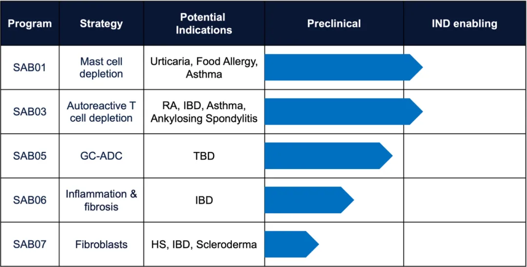 SAB01抑制c-Kit,c-Kit是驱动多种过敏性疾病的肥大细胞上的一个经验证的靶点。从历史上看,由于其在各种其他细胞类型上的表达,该靶点具有毒性限制,包括感染、中性粒细胞减少和精子计数低。为了克服这一点,Santa Ana设计了一种双特异性,仅在存在未公开的锚定靶标(显示仅限于肥大细胞)的情况下,才有条件地阻断c-Kit。在体外和体内,SAB01表现出对抗肥大细胞的条件性活性。SAB01已被命名为开发候选药物,预计明年将开始对慢性诱导性荨麻疹进行I期临床测试。