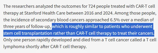 研究发现,当中位随访时间达到3年时,约有6.5%的患者出现了继发性肿瘤。斯坦福大学称这一概率与干细胞移植继发性肿瘤的风险“大致相似”。实际上,癌症治疗后继发恶性肿瘤的情况并不新鲜,通常由放疗、化疗和免疫调节剂治疗后的DNA损伤引起。