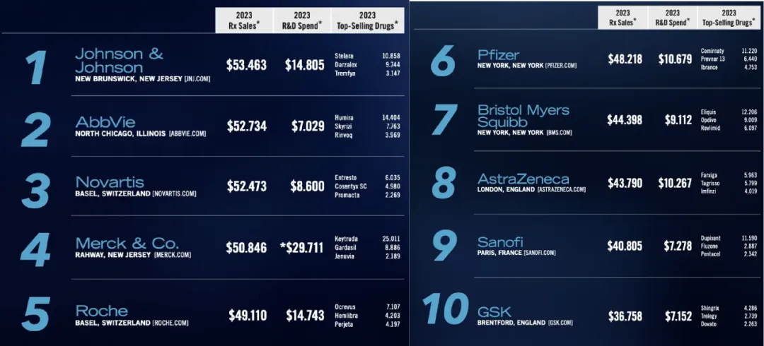 榜单显示,虽然大型制药公司总体表现稳健,但由于新冠相关收入的急剧下滑,辉瑞结束了连续两年的“霸榜” ,全球排名降至第六位。得益于多样化的产品组合推动,强生公司以534.6亿美元的处方药销售额登顶全球首位。