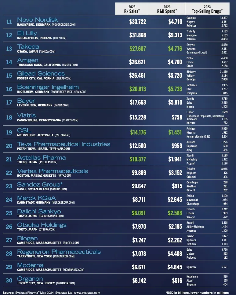 6月14日,美国制药经理人Pharm Exec发布了2024年全球制药企业TOP50榜单。Pharm Exec 50是根据处方药销售额对全球前50名制造商的最新排名。以全球医药市场研究机构Evaluate Pharma数据为基础,榜单包含了过去一年全球50强药企在处方药业务上的销售收入、年度研发投入以及核心产品收入。