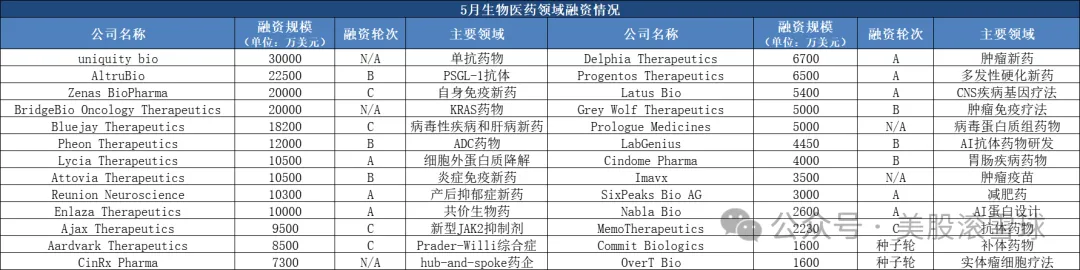 抗体药物领域:5月的前五大融资中,抗体药物企业uniquity bio与AltruBio占据两席,新靶点的ADC药物仍受资本追捧;