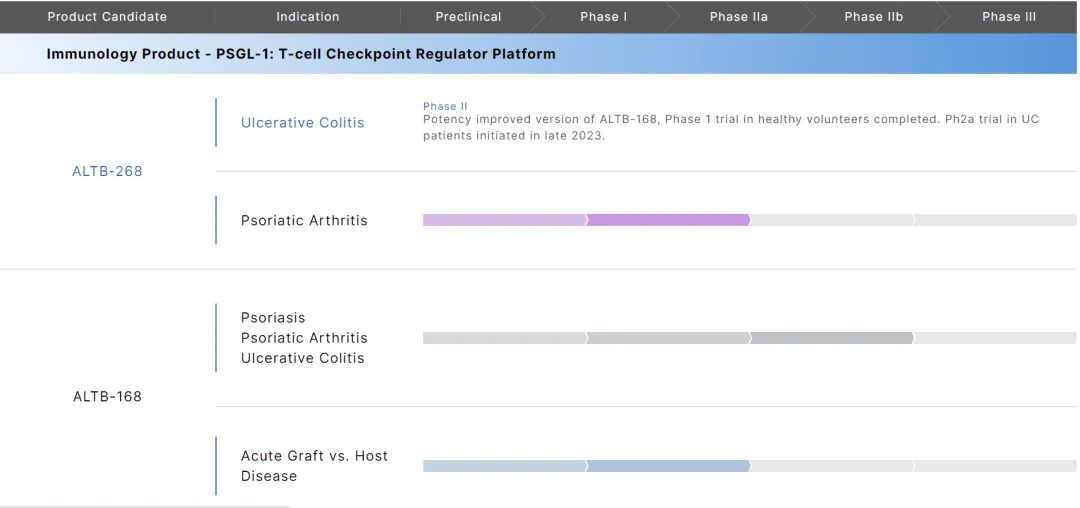 T细胞在与PSGL-1结合时受到肿瘤或病毒抗原刺激,通过ERK和AKT去磷酸化导致TCR信号传导减弱。功能失调的T细胞会丧失细胞因子的产生、存活率降低以及抑制性受体的上调,从而促进其耗竭。ALTB-268目前正处于生物难治性溃疡性结肠炎 (UC) 患者的临床IIa期探索性生物标志物研究中,预计将于2025年上半年公布结果,并正在计划开展针对银屑病关节炎的临床二期试验。