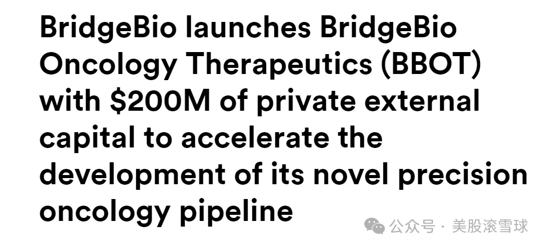 5月1日,BridgeBio Pharma(NASDAQ:BBIO)宣布完成对其前子公司BridgeBio Oncology Therapeutics (BBOT)的2亿美元私人融资,以加速其肿瘤产品组合的开发。本轮超额认购的融资由Cormorant Asset Management与Omega Funds共同领投,Deerfield Management、GV、EcoR1 Capital、Wellington Management、Enavate Sciences、Surveyor Capital、Aisling Capital、Casdin Capital、Longwood Fund等机构跟投。
