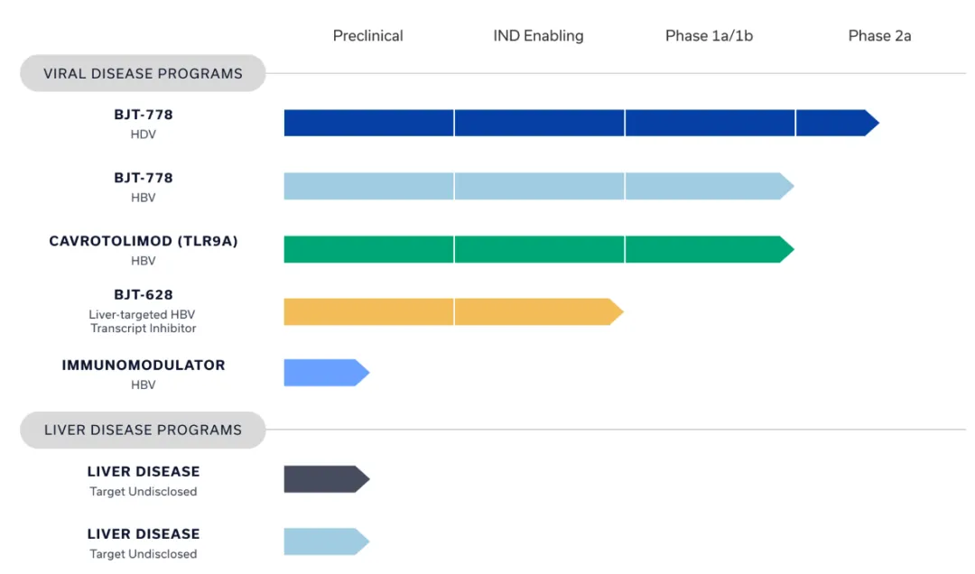 Bluejay正在开发和推进其他针对慢性乙肝的创新项目,包括TLR9激动剂(Cavrotolimod)和肝靶向转录抑制剂(BJT-628),旨在实现更高的功能性治愈率。此外还有2款未披露的肝病管线。