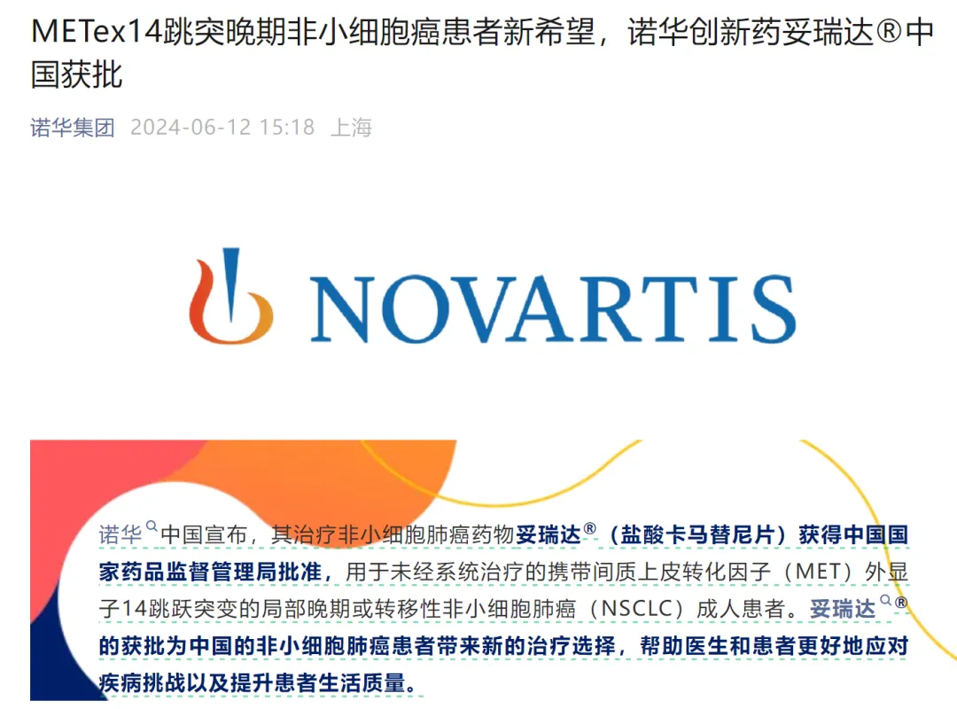 6 月 12 日,诺华中国宣布,其治疗非小细胞肺癌药物妥瑞达®(盐酸卡马替尼片)获得 NMPA 批准,用于未经系统治疗的携带间质上皮转化因子(MET)外显子 14 跳跃突变的局部晚期或转移性非小细胞肺癌(NSCLC)成人患者。