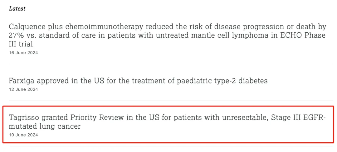 6 月 10 日,阿斯利康宣布奥希替尼(商品名:Tagrisso)用于治疗放化疗(CRT)后不可切除的 EGFR 突变型(外显子 19 缺失或外显子 21(L858R)突变)III 期 NSCLC 患者的新适应症上市申请获 FDA 受理并授予优先审评资格,预计在今年第四季度得到审评决定。