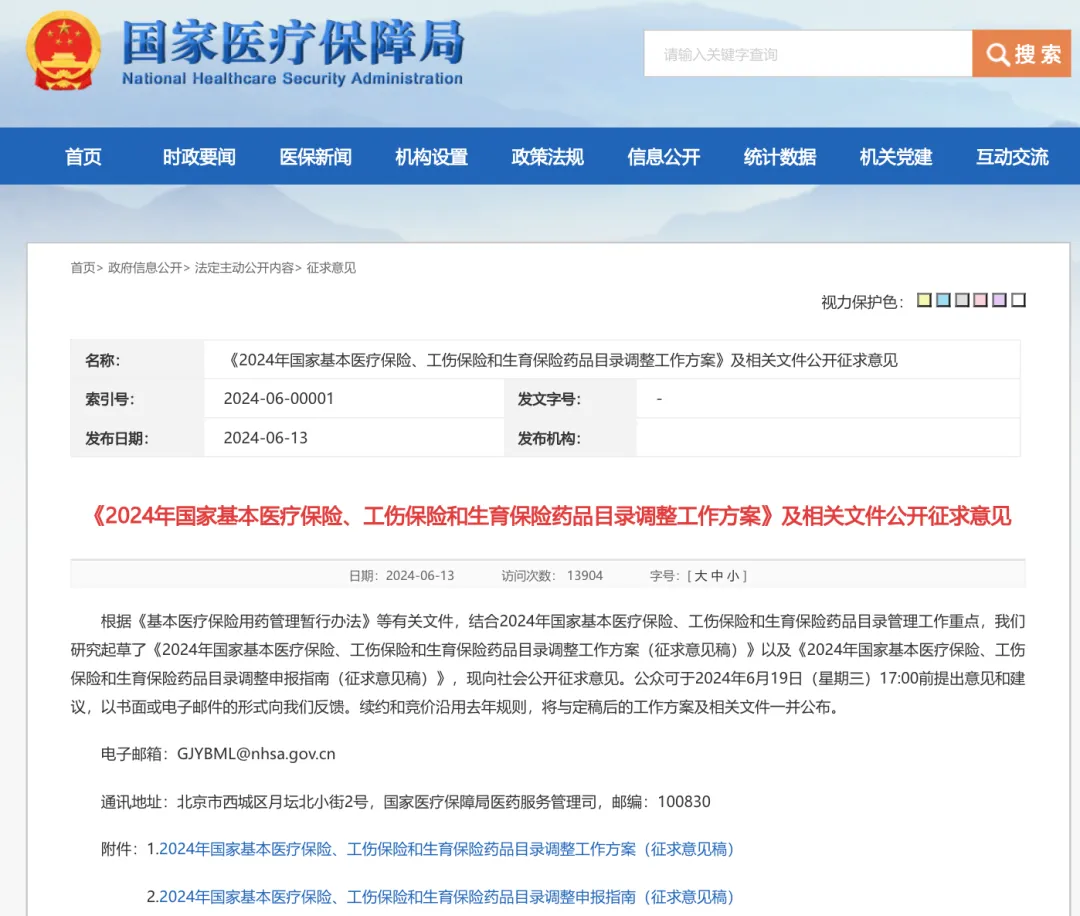 6 月 13 日,医保局发布了《2024年国家基本医疗保险、工伤保险和生育保险药品目录调整工作方案》及相关文件公开征求意见。这意味着新一年的医保目录调整工作已经开始。