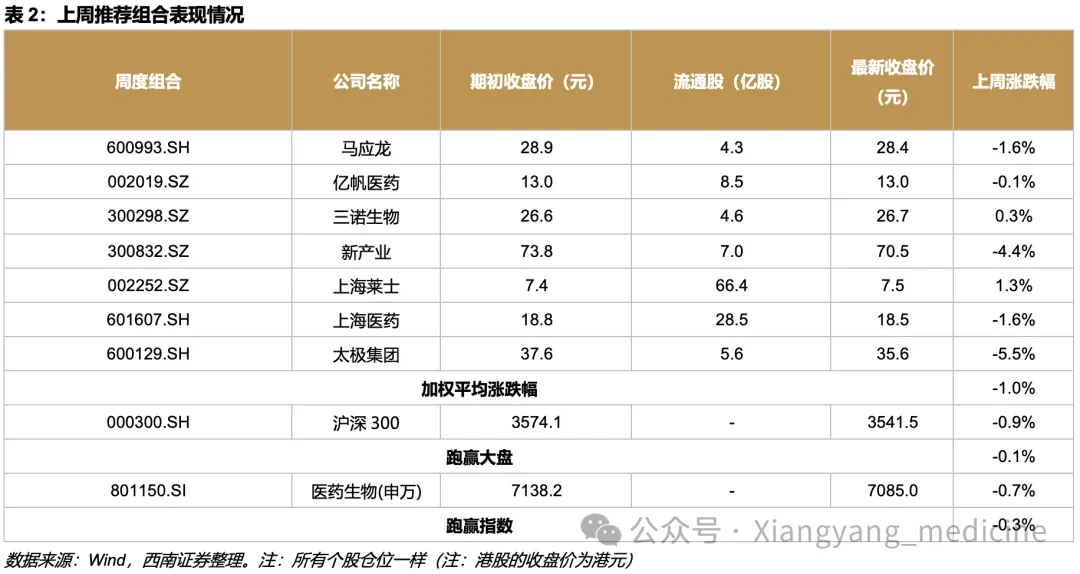 组合收益简评:上周推荐组合整体下跌1%,跑输大盘0.1个百分点,跑输医药指数0.3个百分点。