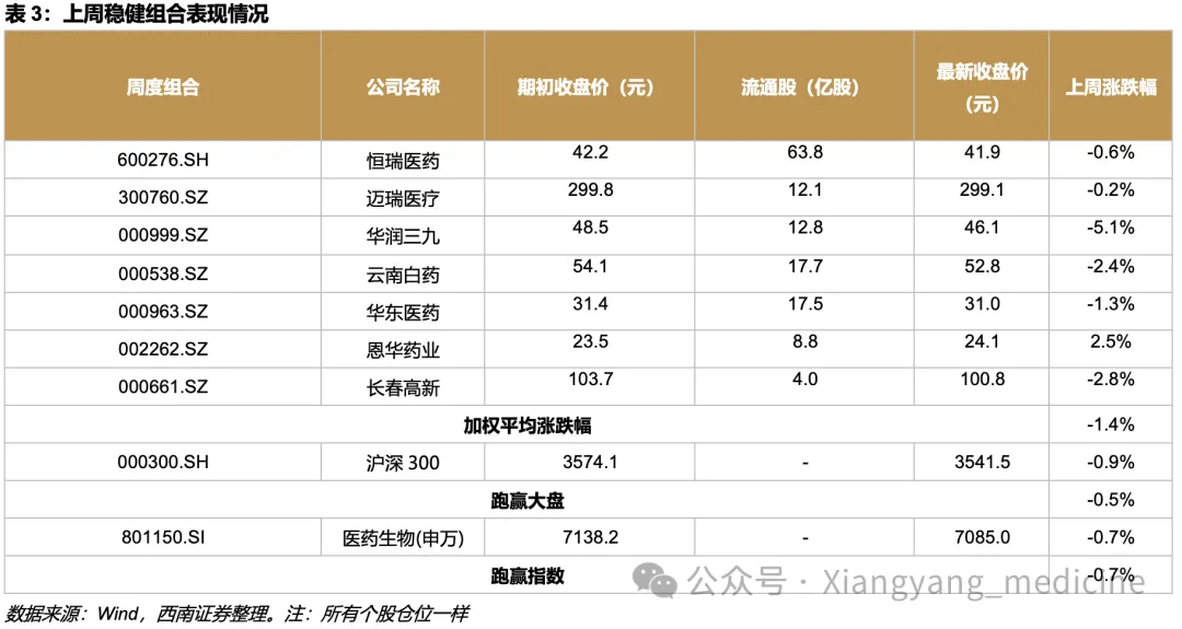 稳健组合:恒瑞医药(600276)、新产业(300832)、迈瑞医疗(300760)、华润三九(000999)、华东医药(000963)、长春高新(000661)。