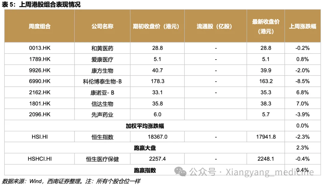 港股组合:荣昌生物(09995)、和黄医药(0013)、爱康医疗(1789)、康方生物(9926)、科伦博泰生物-B(6990)、先声药业(2096)。
