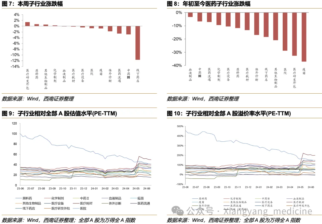 本周相对表现最好的是医疗研发外包,上涨1.4%,其次是原料药和其他生物制品板块,分别上涨0.7%和0.6%,年初以来跌幅最小前三板块分别是血液制品、中药和医药流通,跌幅分别为3.3%、6.7%和7.2%。
