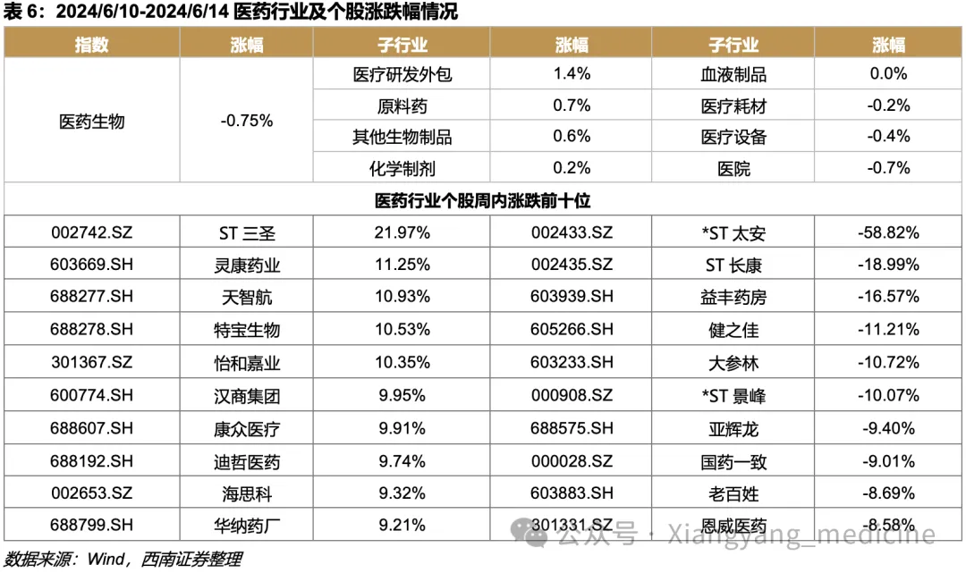 本周跌幅排名前十的个股分别为:*ST太安(-58.8%)、ST长康(-19%)、益丰药房(-16.6%)、健之佳(-11.2%)、大参林(-10.7%)、*ST景峰(-10.1%)、亚辉龙(-9.4%)、国药一致(-9%)、老百姓(-8.7%)、恩威医药(-8.6%)。