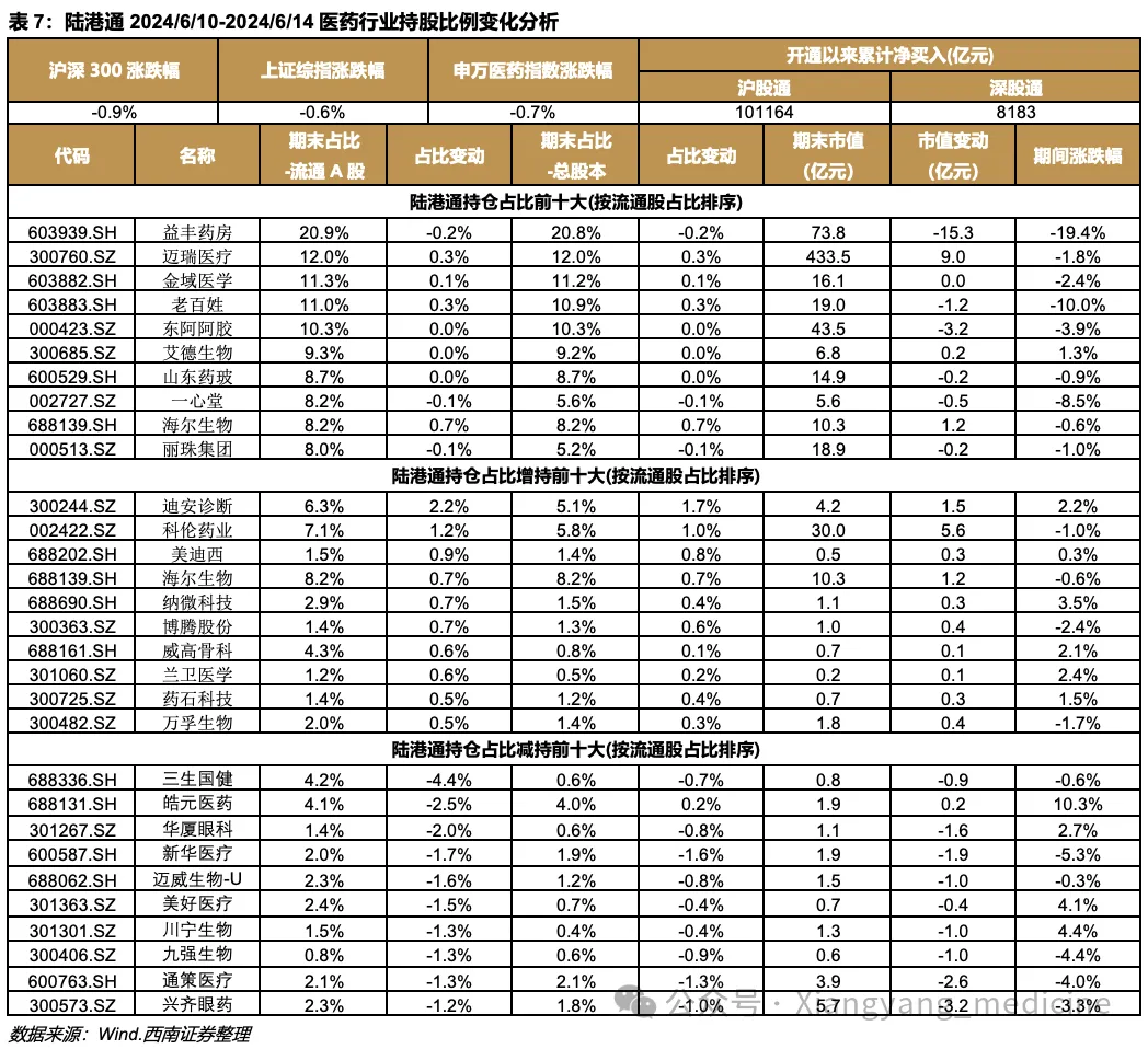 医药陆股通持仓前五分别为:益丰药房、迈瑞医疗、金域医学、老百姓、东阿阿胶;