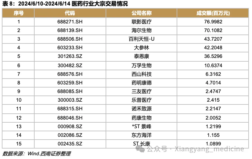 本周医药生物行业中共有15家公司发生大宗交易,成交总金额为3.04亿元,大宗交易成交前三名:联影医疗、海尔生物、百利天恒-U,占总成交额的62.82%。