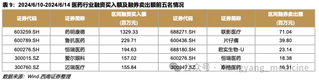 本周融资买入标的前五名分别为:药明康德、鲁抗医药、恒瑞医药、爱尔眼科、迈瑞医疗;