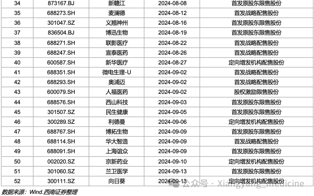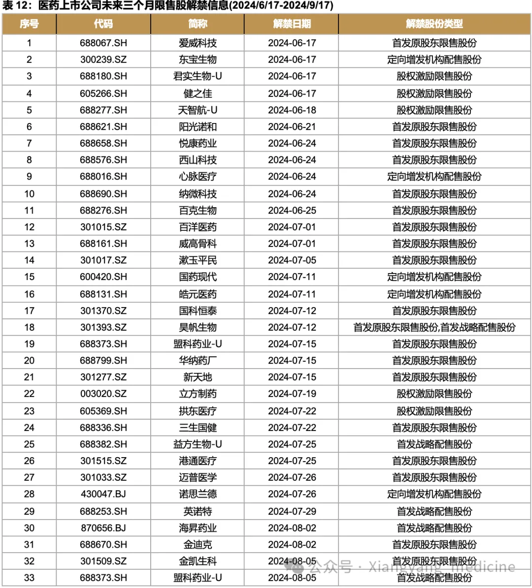 截至2024年6月14日公告信息,未来三个月内有限售股解禁的医药上市公司共有52家。