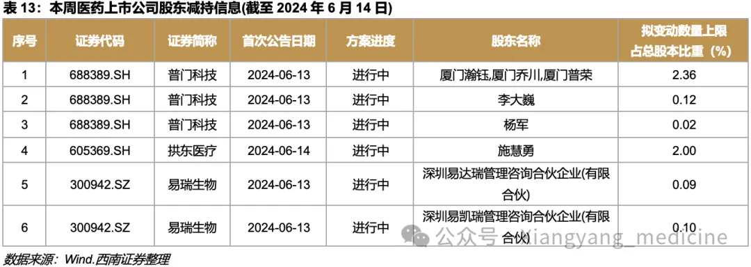 截至2024年6月7日本周共6家医药上市公司股东减持。