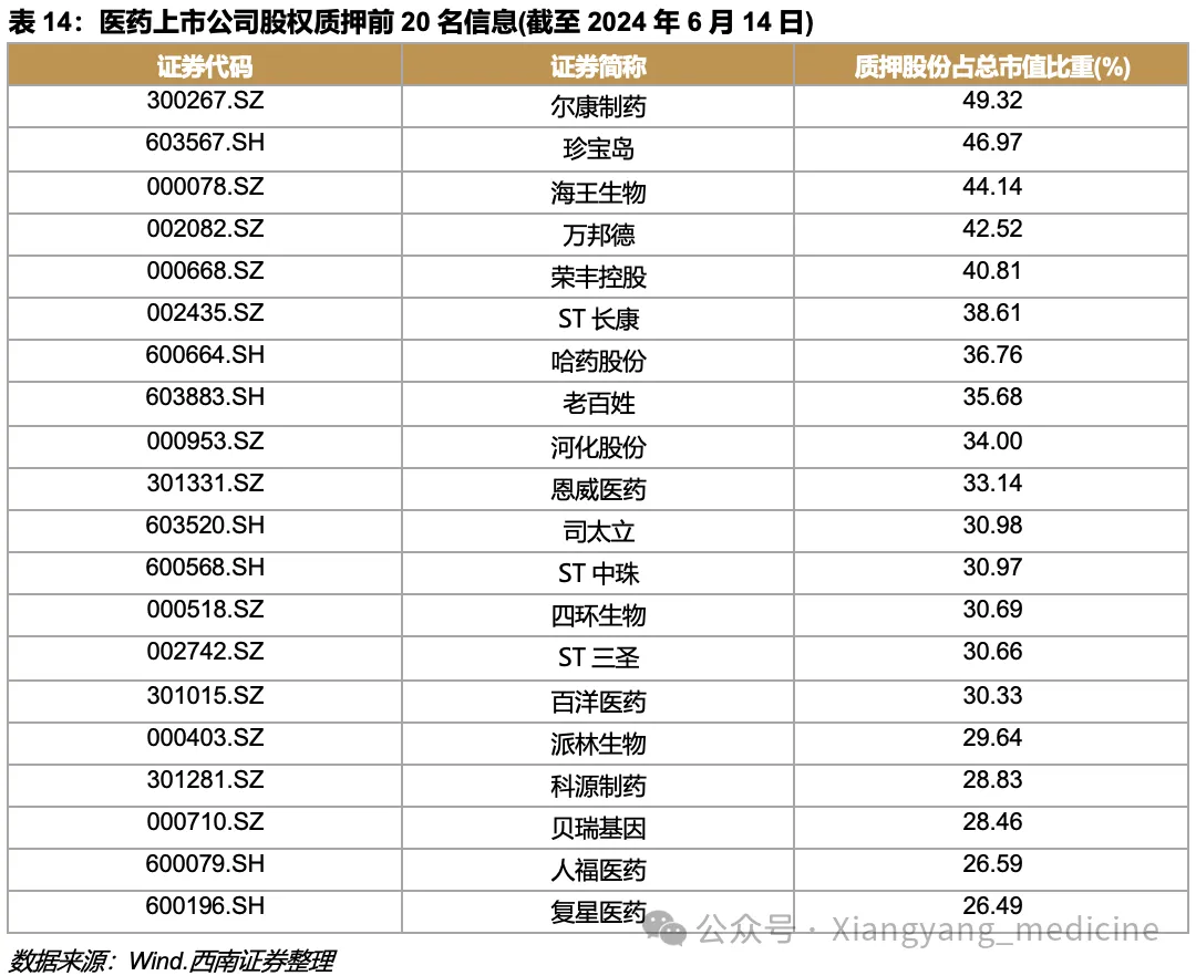截至2024年6月14日,医药上市公司股权质押前10名的公司分别为尔康制药、珍宝岛、海王生物、万邦德、荣丰控股、ST长康、哈药股份、老百姓、河化股份、恩威药业。