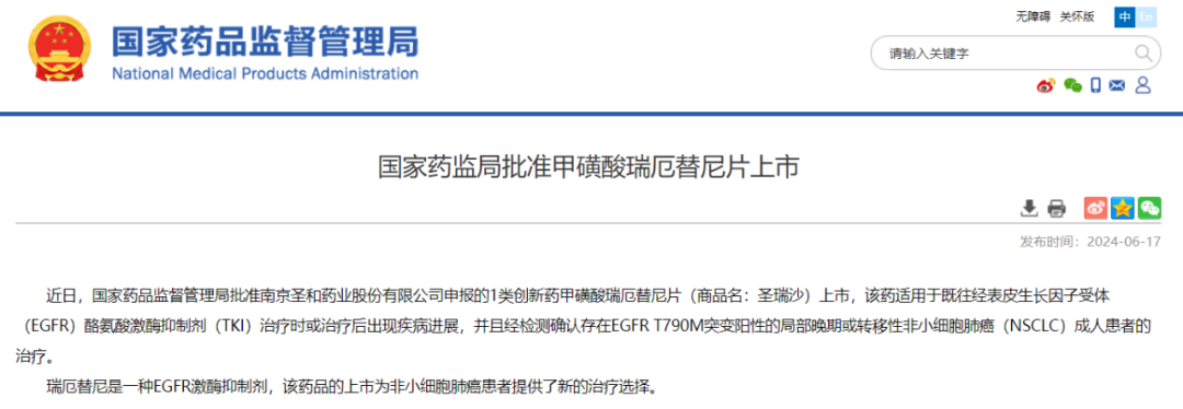 2024年06月17日 ,国家药品监督管理局(NMPA)官方网站公示,南京圣和药业股份有限公司自主研发的化学1类创新药品种「甲磺酸瑞厄替尼片」(商品名:圣瑞沙,受理号:CXHS2101058)获得NMPA批准上市。该药适用于既往经表皮生长因子受体(EGFR)酪氨酸激酶抑制剂(TKI)治疗时或治疗后出现疾病进展,并且经检测确认存在EGFR T790M突变阳性的局部晚期或转移性非小细胞肺癌(NSCLC)成人患者的治疗。