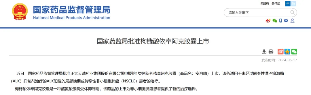 枸橼酸依奉阿克胶囊:正大天晴药业集团股份有限公司申报的1类创新药依奉阿克胶囊(商品名:安洛晴);该药适用于未经过间变性淋巴瘤激酶(ALK)抑制剂治疗的ALK阳性的局部晚期或转移性非小细胞肺癌(NSCLC)患者的治疗。