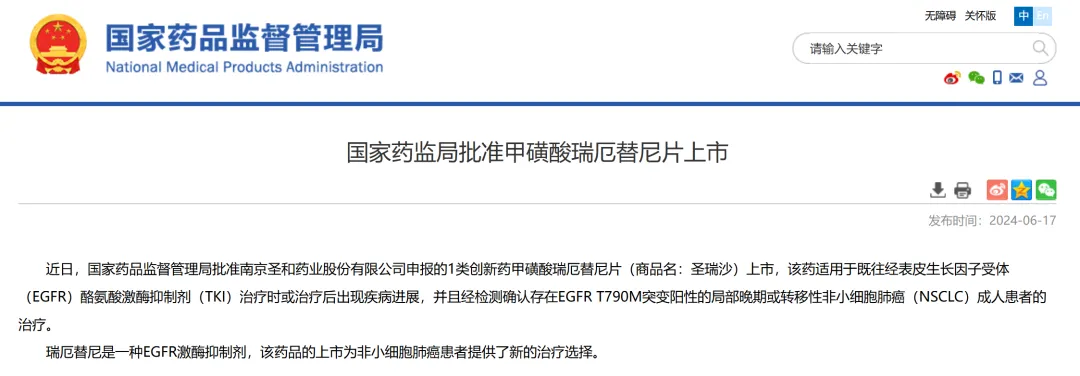 甲磺酸瑞厄替尼片:南京圣和药业股份有限公司申报的1类创新药甲磺酸瑞厄替尼片(商品名:圣瑞沙);该药适用于既往经表皮生长因子受体(EGFR)酪氨酸激酶抑制剂(TKI)治疗时或治疗后出现疾病进展,并且经检测确认存在EGFRT790M突变阳性的局部晚期或转移性非小细胞肺癌(NSCLC)成人患者的治疗。