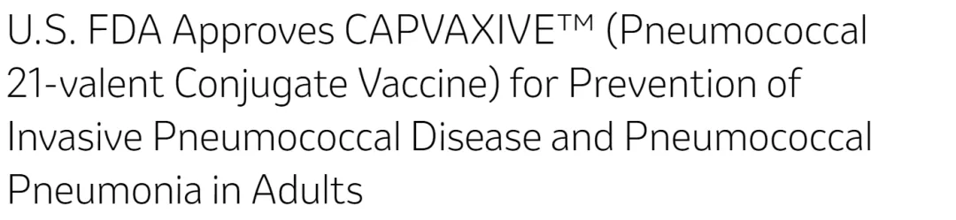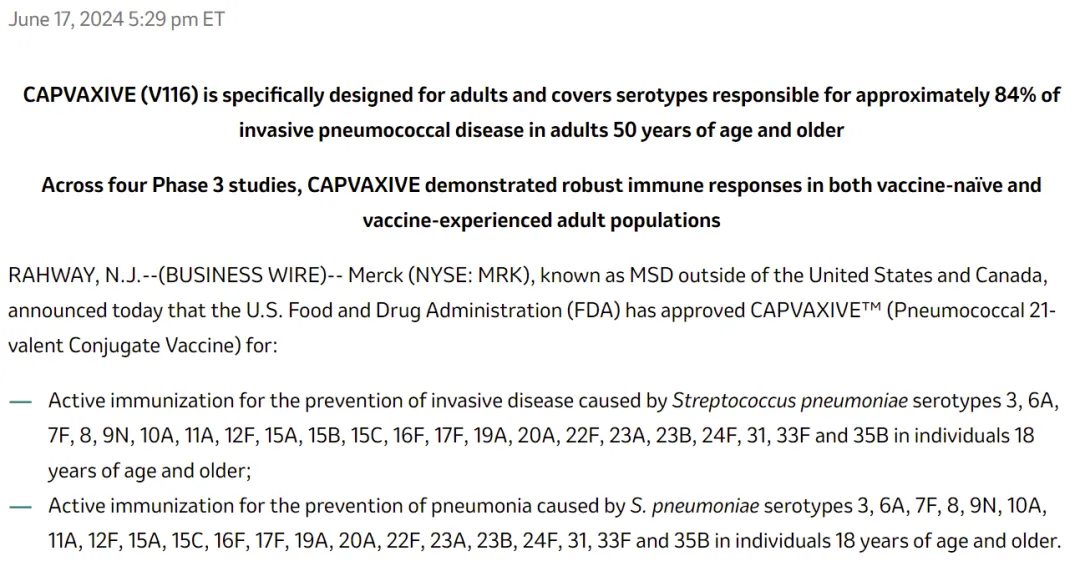 2024年6月17日,默沙东宣布其21价肺炎结合疫苗获得FDA批准上市,用于预防18岁以上成人感染肺炎球菌,商品名为Capvaxive,对于50岁以上成人的侵袭性肺炎球菌病来说,这21种血清型可以覆盖84%。